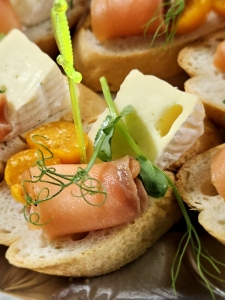 Канапе с сырокопчёной колбасой, тостерным хлебом, сыром, свежим огурцом и маслиной